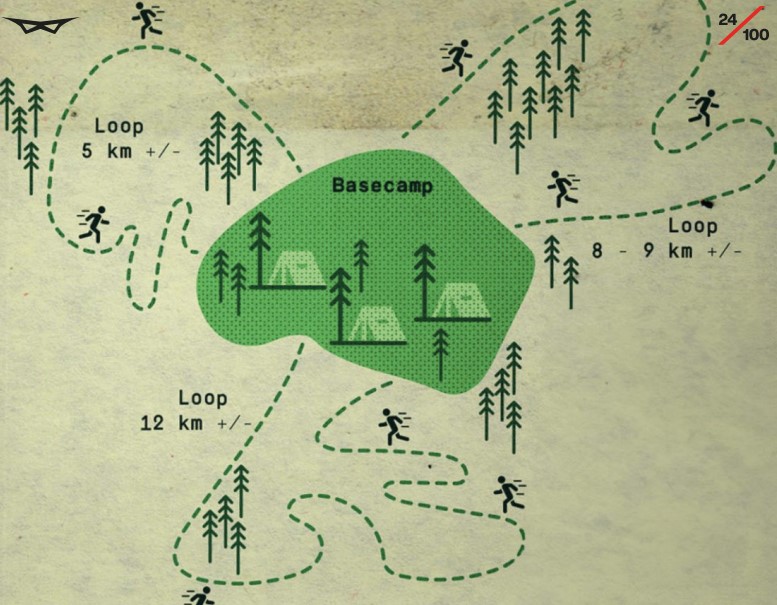 Una carrera de trail de relevos en equipos de 5 personas, formada por 3 loops de diferentes distancias. Mientras un corredor está haciendo un loop, el resto del equipo lo espera en Base Camp 24/100.